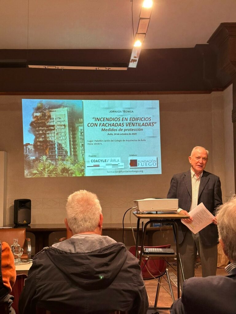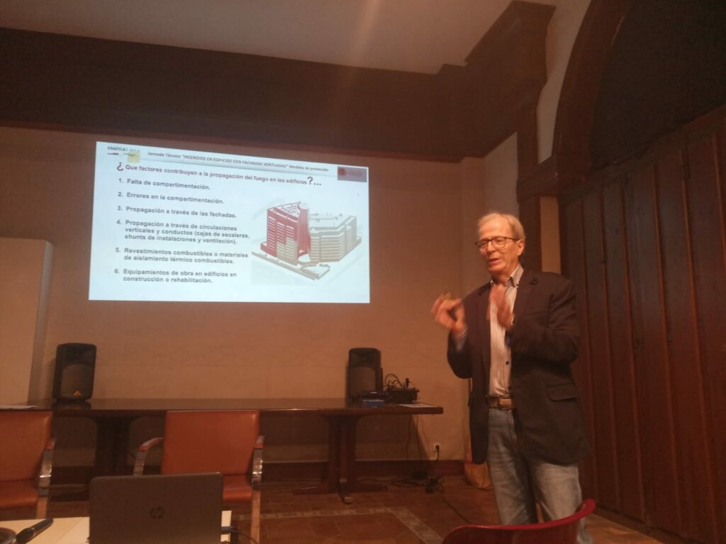 - “Construcción de edificios con fachadas ventiladas”, impartida por Alfredo Delgado, asesor de Fundación Fuego y exjefe de Bomberos de Ávila, quien explicó los distintos tipos de sistemas constructivos y los mecanismos que influyen en la propagación del fuego en función de los parámetros arquitectónicos y materiales empleados.