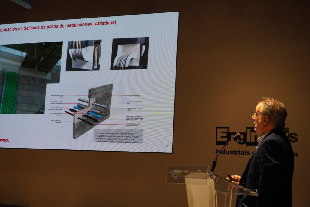 - Albert Grau (Rockwool España), que destacó la relación entre sostenibilidad y seguridad a través de la protección pasiva y resistencia al fuego. Indicó las actuaciones necesarias para conseguir edificios protegidos contra el fuego, con las aportaciones que se hacen mediante una Protección Pasiva bien estudiada y con materiales adecuados. Hay que construir edificios sostenibles y un edificio que se incendia no es sostenible. La Sostenibilidad y la Seguridad contra incendios tienen que ir de la mano.