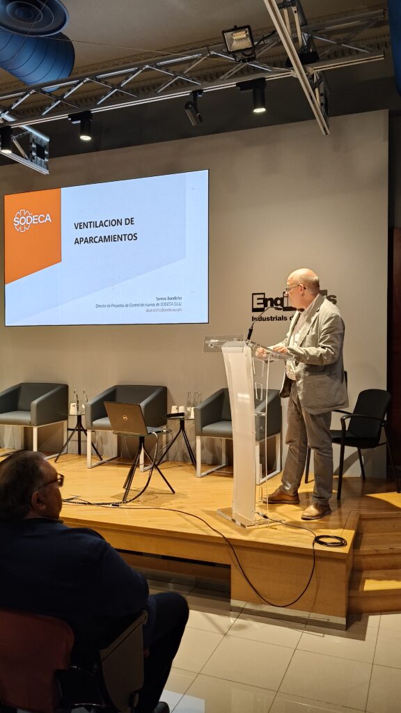 - Santos Bendicho (Sodeca), que analizó los sistemas de control y evacuación de humos según el CTE DB-SI y el RIPCI con sistemas de control de humos y temperatura. Santos profundizo lo que recoge el Código Técnico, CTE DB SI 3 sobre el control de humo de incendio, explicando que lo considera más un sistema de Extracción que el de Control de humos, lo mismo ocurre con el RIPCI. Desarrolló cómo deberías ser las instalaciones de control de humos y sus sistemas de evacuación.