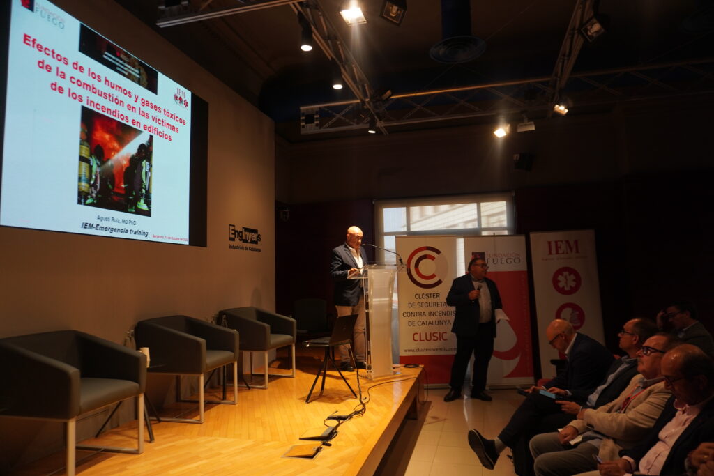 - Dr. Agustí Ruiz (IEM/Fundación Fuego), que abordó los efectos de los humos y gases tóxicos sobre las víctimas y la importancia de la prevención entre los equipos de emergencia. efectos de humos y gases tóxicos sobre las víctimas. El Dr. Ruíz expuso los efectos que producen los humos y gases tóxicos de los incendios sobre las víctimas. Haciendo especial hincapié en que cualquier victima que haya sido rescatada de un espacio cerrado lleno de humo, debe ser tratada inmediatamente con evaluación de grave. Recordó que los Bomberos también se ven expuestos a riesgos debidos a los humos. El Equipo de Protección y el Respiratorio le protegen, si bien se están dando casos de canceres por contaminación dérmica, a través de la piel. Muy importante el considerar los verdugos o Capucha especiales, así como los procedimientos de prevención y limpieza de Equipos.