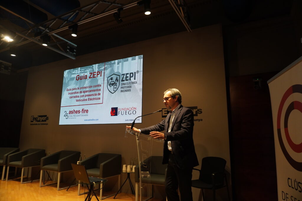 - Justo Adámez (Ashes-Fire), que explico la protección zona de carga de vehículos eléctricos- Proyecto ZEPI. Abordó la idea, que aunque no hay desarrollada una normativa contra incendios, se debe tener en cuenta que en determinadas actividades, donde exista personal de la empresa, hay que contemplar la Ley de Prevención de Riesgos laborales, que obliga a la adopción de medidas contra los riesgos, protegiendo a los trabajadores. Para ello, explicó el estudio y proyecto que ha cristalizado en una Guía ZEPI-VE (Vehículos Eléctricos), en la que se contempla todas las medidas necesarias y procedimientos, siguiendo estándares internacionales.